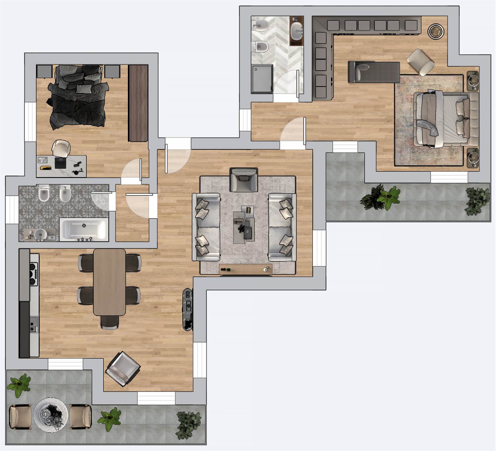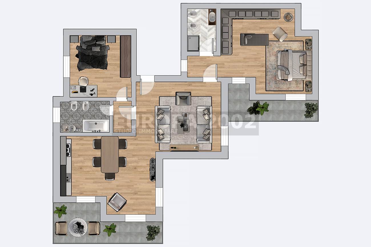 Due spaziose camere da letto matrimoniali e due bagni completi, mentre un ampio ripostiglio offre spazio aggiuntivo per organizzare al meglio.